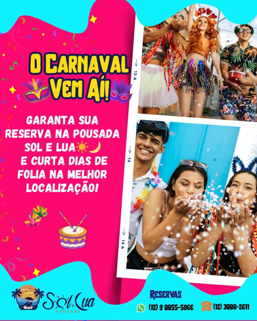 🎊🎉 Garanta a sua hospedagem para o Carnaval 2026 na Pousada Sol e Lua e prepare-se para a maior festa do ano!
